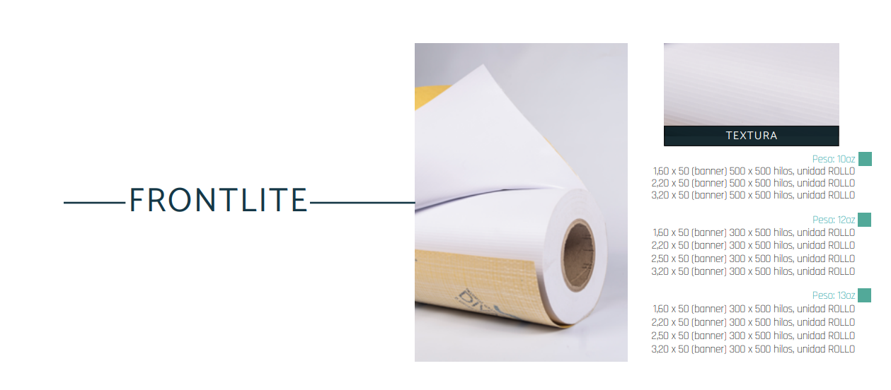 Peso: 10oz 1,60 x 50 (banner) 500 x 500 hilos, unidad ROLLO 2,20 x 50 (banner) 500 x 500 hilos, unidad ROLLO 3,20 x 50 (banner) 500 x 500 hilos, unidad ROLLO Peso: 12oz 1,60 x 50 (banner) 300 x 500 hilos, unidad ROLLO 2,20 x 50 (banner) 300 x 500 hilos, unidad ROLLO 2,50 x 50 (banner) 300 x 500 hilos, unidad ROLLO 3,20 x 50 (banner) 300 x 500 hilos, unidad ROLLO Peso: 13oz 1,60 x 50 (banner) 300 x 500 hilos, unidad ROLLO 2,20 x 50 (banner) 300 x 500 hilos, unidad ROLLO 2,50 x 50 (banner) 300 x 500 hilos, unidad ROLLO 3,20 x 50 (banner) 300 x 500 hilos, unidad ROLLO