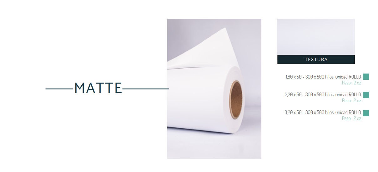 1,60 x 50 - 300 x 500 hilos, unidad ROLLO Peso: 12 oz 2,20 x 50 - 300 x 500 hilos, unidad ROLLO Peso: 12 oz 3,20 x 50 - 300 x 500 hilos, unidad ROLLO Peso: 12 oz